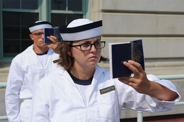 I-Day concludes when the midshipmen take the Oath of Office in front of their family, friends and new classmates during a ceremony in Tecumseh Court at 6 p.m. After the ceremony, plebes say goodbye to their families who will not see them again until Plebe Parents Weekend, Aug. 13-16.