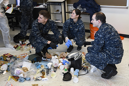 The simulation brought together more than 150 volunteers with students from NWC, Harvard, Massachusetts Institute of Technology, Tufts University and humanitarian nongovernmental organizations to create a constantly changing environment. Many of the exercise participants had real-world HA/DR experience, and were able to give feedback to the midshipmen.